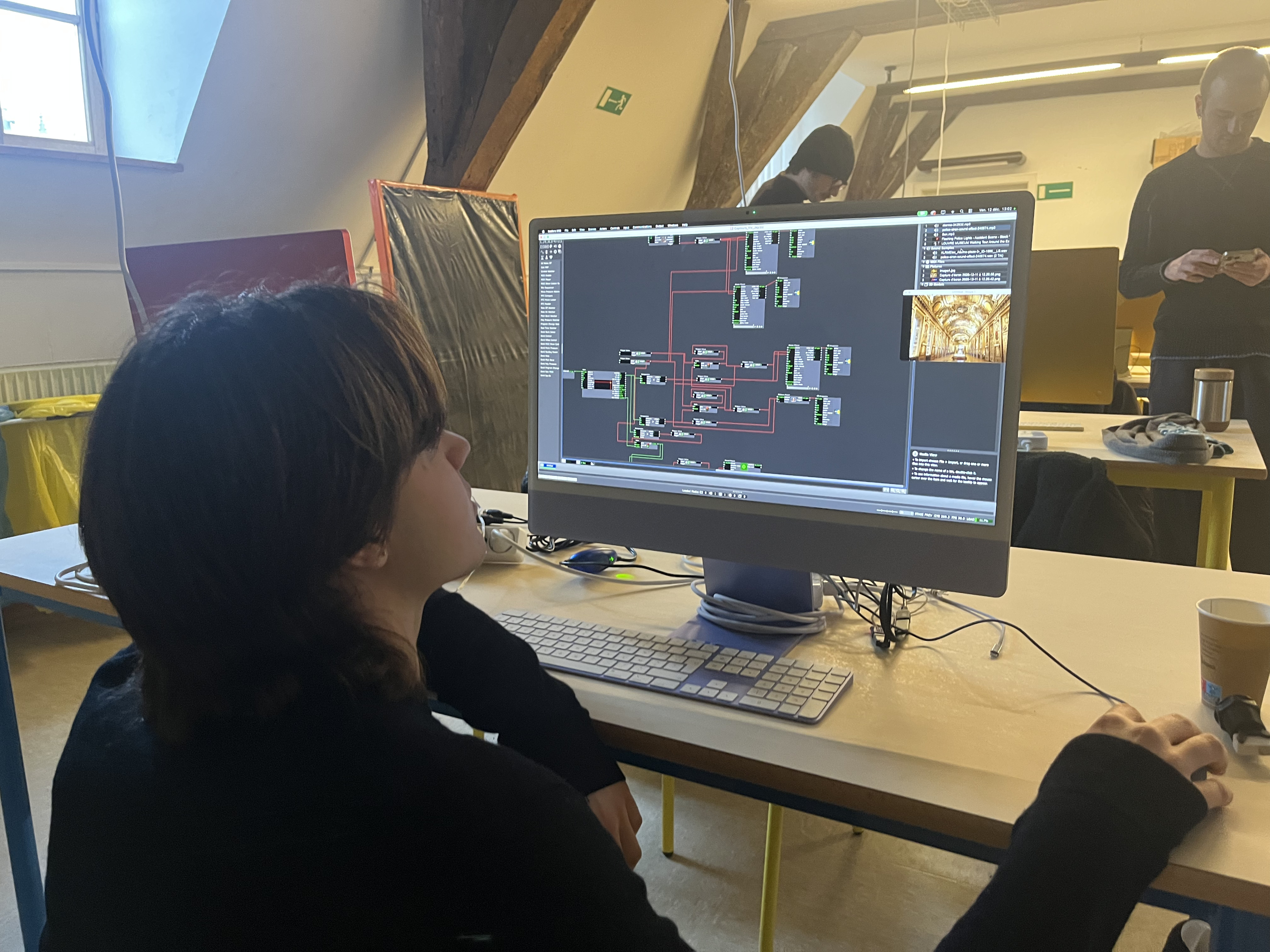 Le projet a été développé à l’aide du logiciel ISADORA. Une caméra permet la détection des mouvements grâce à la boîte Différence, tandis qu’un capteur physique de type bouton poussoir déclenche certaines actions narratives. Un capteur d’image (Eyes) sont utilisés pour l’analyse visuelle, et l’ensemble du dispositif génère à la fois des images projetées et une création sonore synchronisée, renforçant l'immersion de la performance.